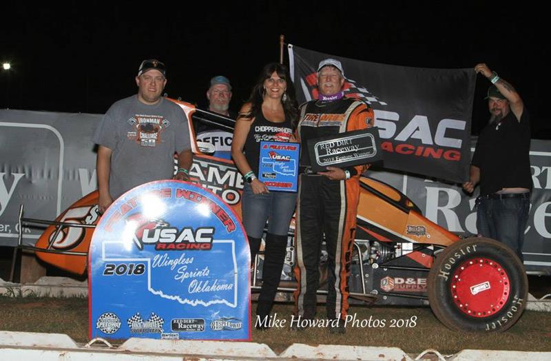 The USAC Wingless Sprints Oklahoma Red Dirt Rumble Championship was a great race as these daredevils tempted fate by cleaning the red clay from the concrete wall on the outside of turns 3&4 for twenty five laps! After some very tight battles through traffic it was the "Old Man" Danny Smith taking his Orange Taxi to the Red Dirt Raceway Winners Circle over "Hot Rod" Johnny Kent and Cameron Hagin! Brett Wilson was able to recover from involvement from an early accident and fight his way back to a tenth place finish which was just good enough to secure the USAC Wingless Sprints of Oklahoma Season Championship!